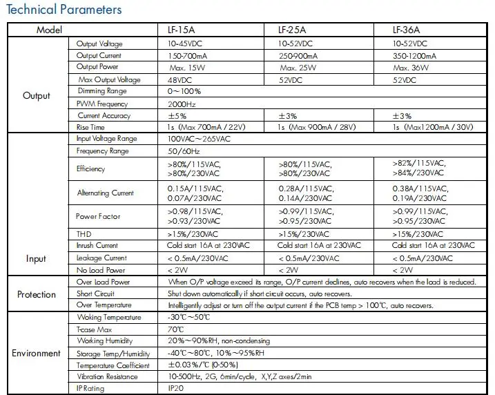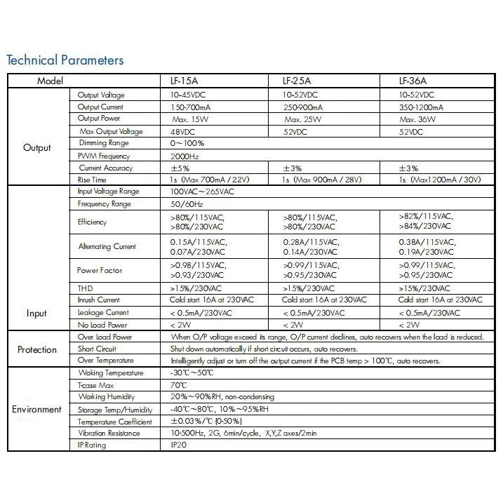 Automatische Spannungskonformität: Der Treiber passt seine Ausgangsspannung automatisch an den Durchlassspannungsbedarf der angeschlossenen LED-Last an, innerhalb seines angegebenen Bereichs (z. B. 12–24 VDC, 20–40 VDC).