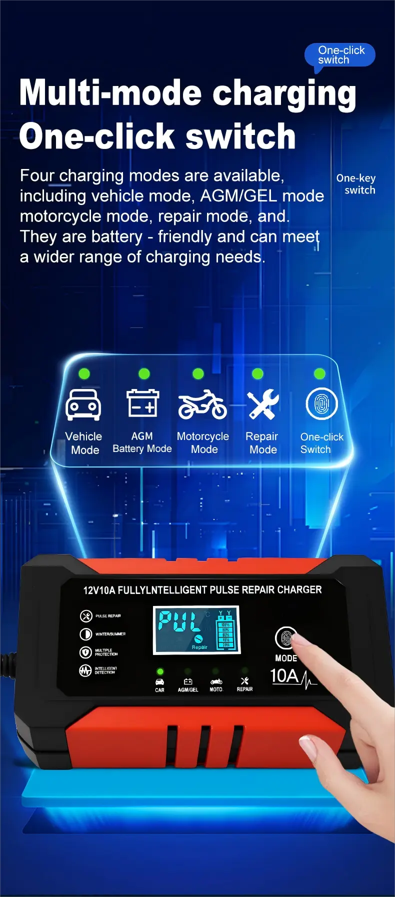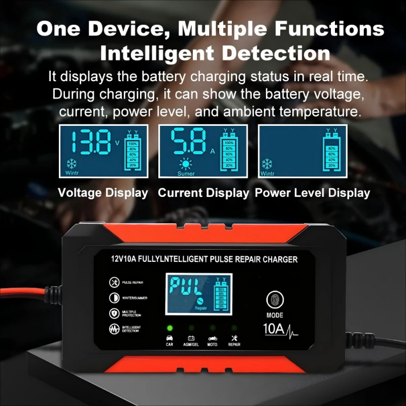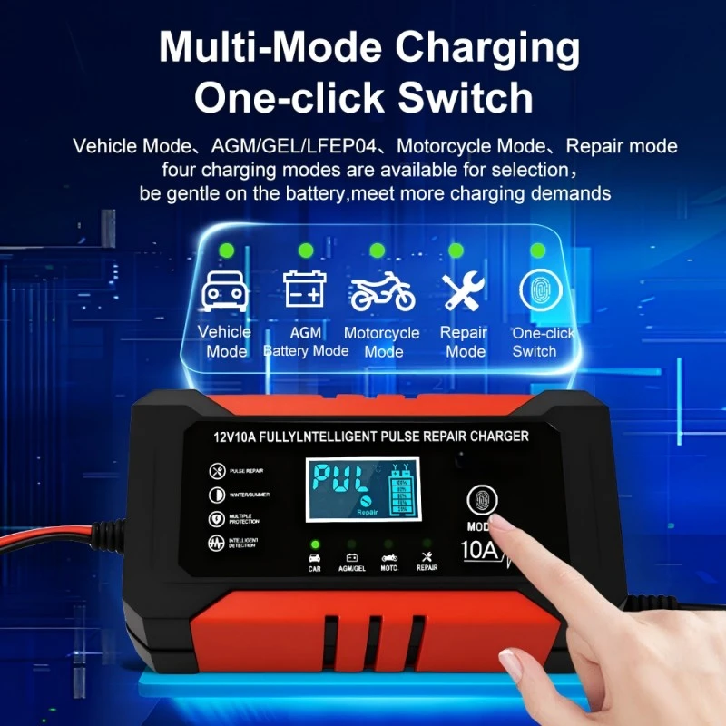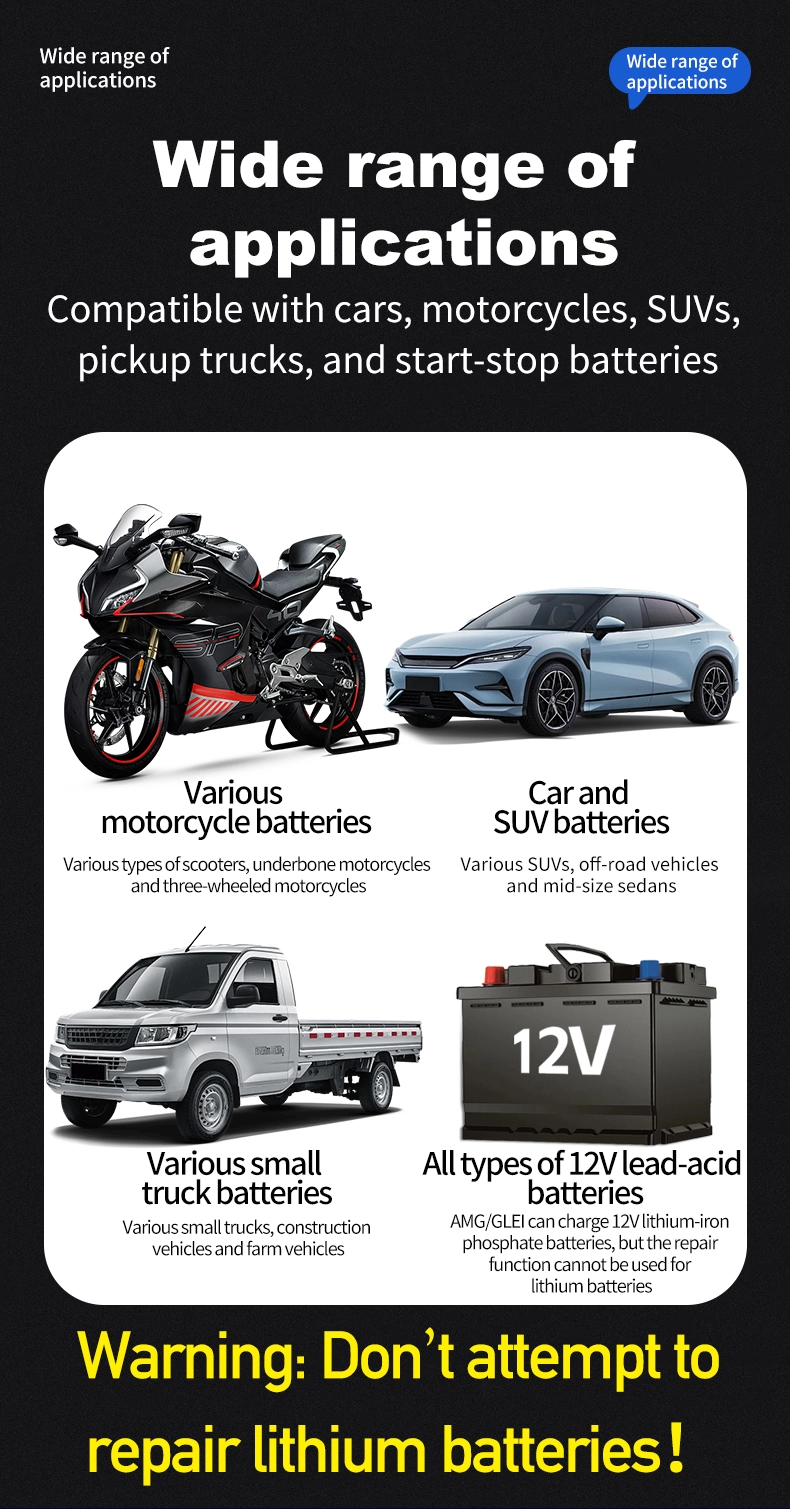 1. Universelle Kompatibilität und Unterstützung mehrerer Batterien: Es funktioniert nahtlos mit allen 12-V-Batterietypen, einschließlich Blei-Säure, AGM, Gel und LiFePO4, und deckt Batteriekapazitäten von 6 Ah bis 180 Ah ab. Der breite Eingangsbereich von 110–230 V eliminiert regionale Einschränkungen und ermöglicht den Einsatz in über 100 Ländern und Regionen auf der ganzen Welt.