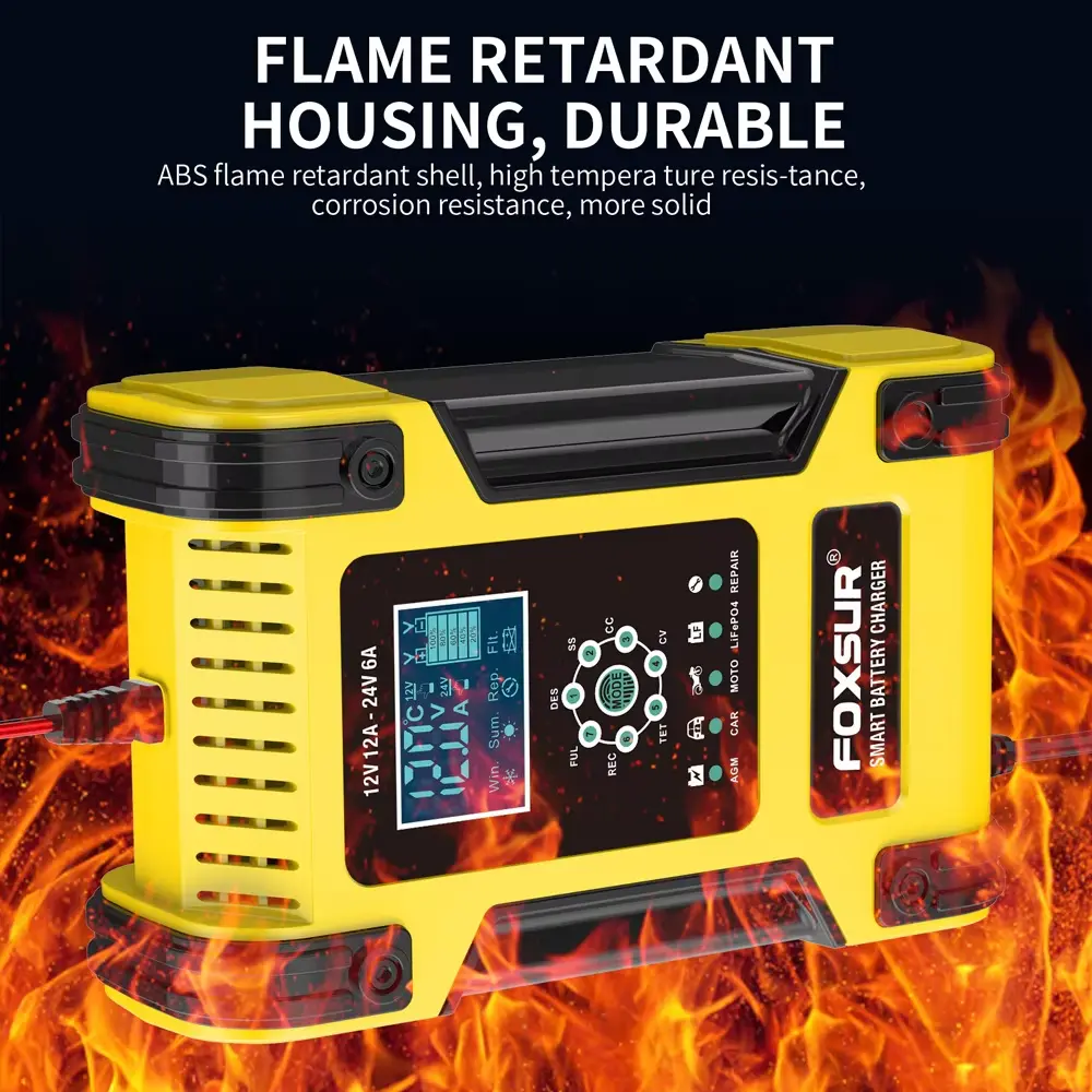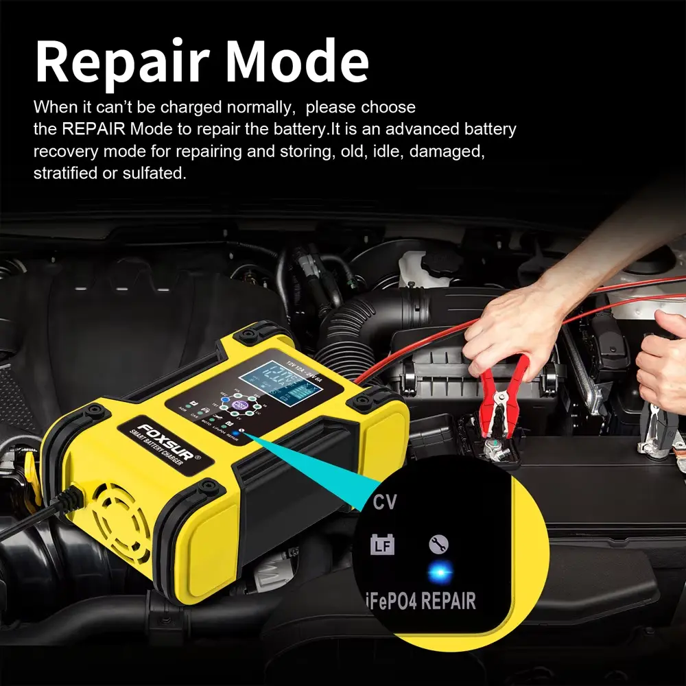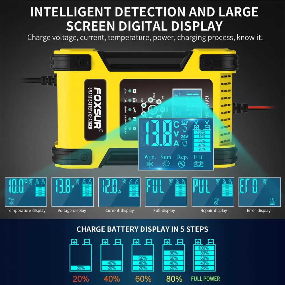 • 7-Stufen-Ladegeräte sind für die meisten Batterietypen geeignet, einschließlich Calcium-, Gel-AGM-, LiFePo4-, Nass- und Blei-Säure-Batterien. Sie können auch dabei helfen, entladene und sulfatierte Batterien wiederherzustellen.