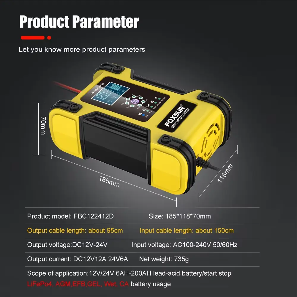 • Batterietypen: Die meisten Arten von Blei-Säure-Batterien, einschließlich Kalzium, Gel-AGM, LiFePo4, Nassbatterien, Blei-Säure-Batterien usw.
