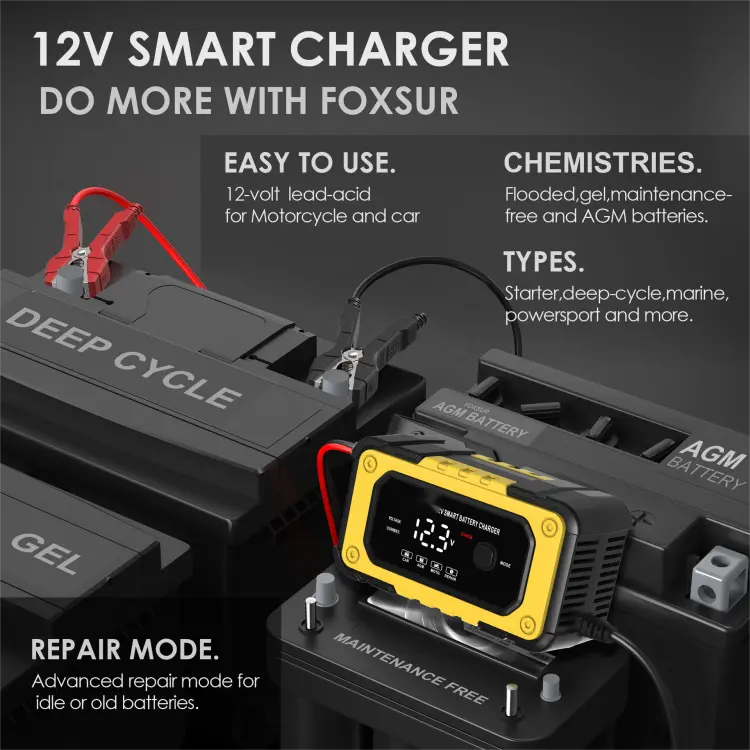 Starwell, ein professioneller Hersteller und Lieferant intelligenter Batterieladegeräte aus China, präsentiert das vollintelligente 12-V-6A-Batterieladegerät mit automatischer Reparatur, ein hochmodernes Gerät, das den Ladeanforderungen verschiedener Blei-Säure-Batterien gerecht wird. Egal, ob Sie Autobatterien, Motorräder, Geländefahrzeuge, Rasentraktoren oder sogar Boote aufladen müssen, dieses Ladegerät ist ein unverzichtbares Werkzeug, damit Ihre Fahrzeuge reibungslos funktionieren. Mit seiner fortschrittlichen Technologie und seinen multifunktionalen Fähigkeiten bietet dieses Ladegerät mehr als nur eine typische Ladelösung.