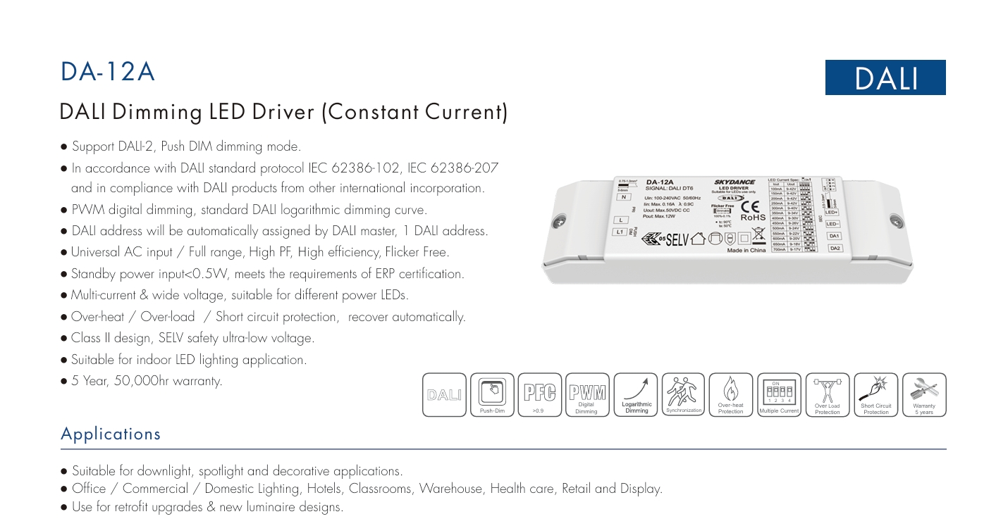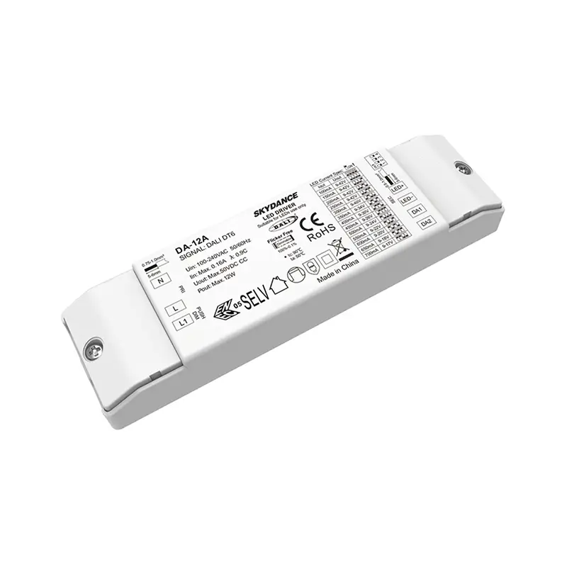 Der hochwertige 12-W-Konstantstrom-DALI-Dimm-LED-Treiber von STARWELL ist ein Hochleistungskern für intelligente Beleuchtungssysteme, kompatibel mit globalen DALI-Protokollen und einem 100–240 V AC breiten Eingang. Der dimmbare DALI-LED-Treiber liefert einen stabilen Konstantstromausgang (100–900 mA einstellbar) mit einer Genauigkeit von ±5 % und sorgt so für eine gleichmäßige Helligkeit aller Leuchten. Mit der T-PWM-Dimmtechnologie erreicht es eine ultratiefe Dimmung von 0,0001 % bis 100 % ohne Flimmern und erfüllt damit die IEEE 1789-Standards für Augenkomfort. Mit einem PF>0,95 und einem Wirkungsgrad von bis zu 87 % reduziert es die Energieverschwendung, während der IP20-Schutz und der Betriebstemperaturbereich von -20 bis 50 °C für Wohn-, Gewerbe- und Industrieszenarien geeignet sind.