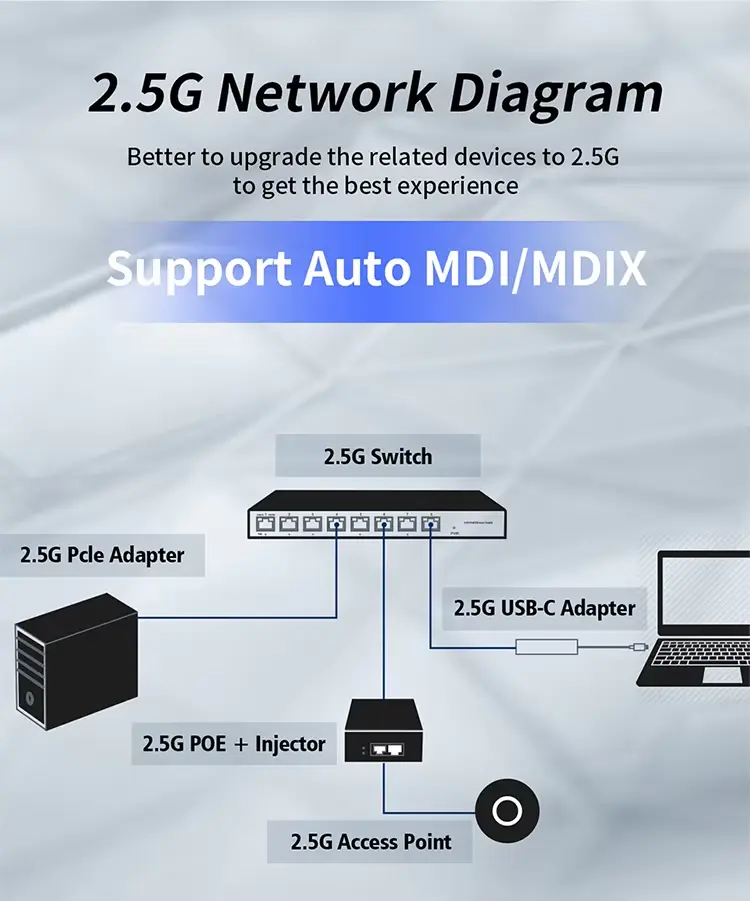 Bleiben Sie mit der Unterstützung von Datengeschwindigkeiten von 2,5 Gbit/s der Bandbreitenkurve immer einen Schritt voraus und sind vollständig abwärtskompatibel mit 10/100/1000 Mbit/s-Geräten.
