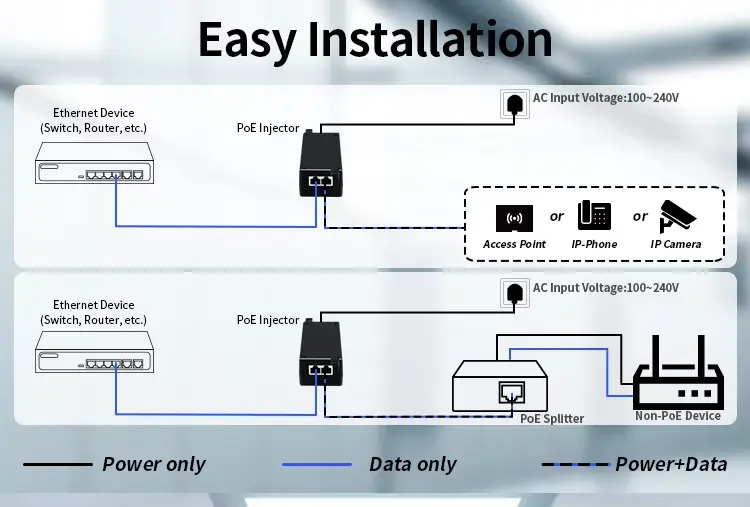 Leistungskompatibilität: Kompatibel mit IEEE802.3af (15,4 W), IEEE802.3at (30 W) und sogar IEEE802.3bt (90 W) / PoE++ (60 W) Geräten.