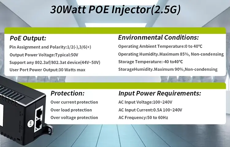 Als professioneller Hersteller in China möchte Starwell Ihnen hochwertige 2,5-G-Single-Port-30-W-POE-Injektoren anbieten. Durch die Kombination ultraschneller 2,5-G-Konnektivität mit einer vielseitigen 30-W-Ausgangsleistung (kompatibel mit höheren Standards) bietet es eine zukunftssichere Lösung für die Stromversorgung von Wi-Fi 6-Zugangspunkten, hochauflösenden PTZ-Kameras und anderen anspruchsvollen Netzwerkgeräten. Es wurde für eine elegante, einfache Integration entwickelt und bietet Plug-and-Play-Funktionalität, die durch CE-, RoHS- und FCC-Zertifizierungen unterstützt wird.