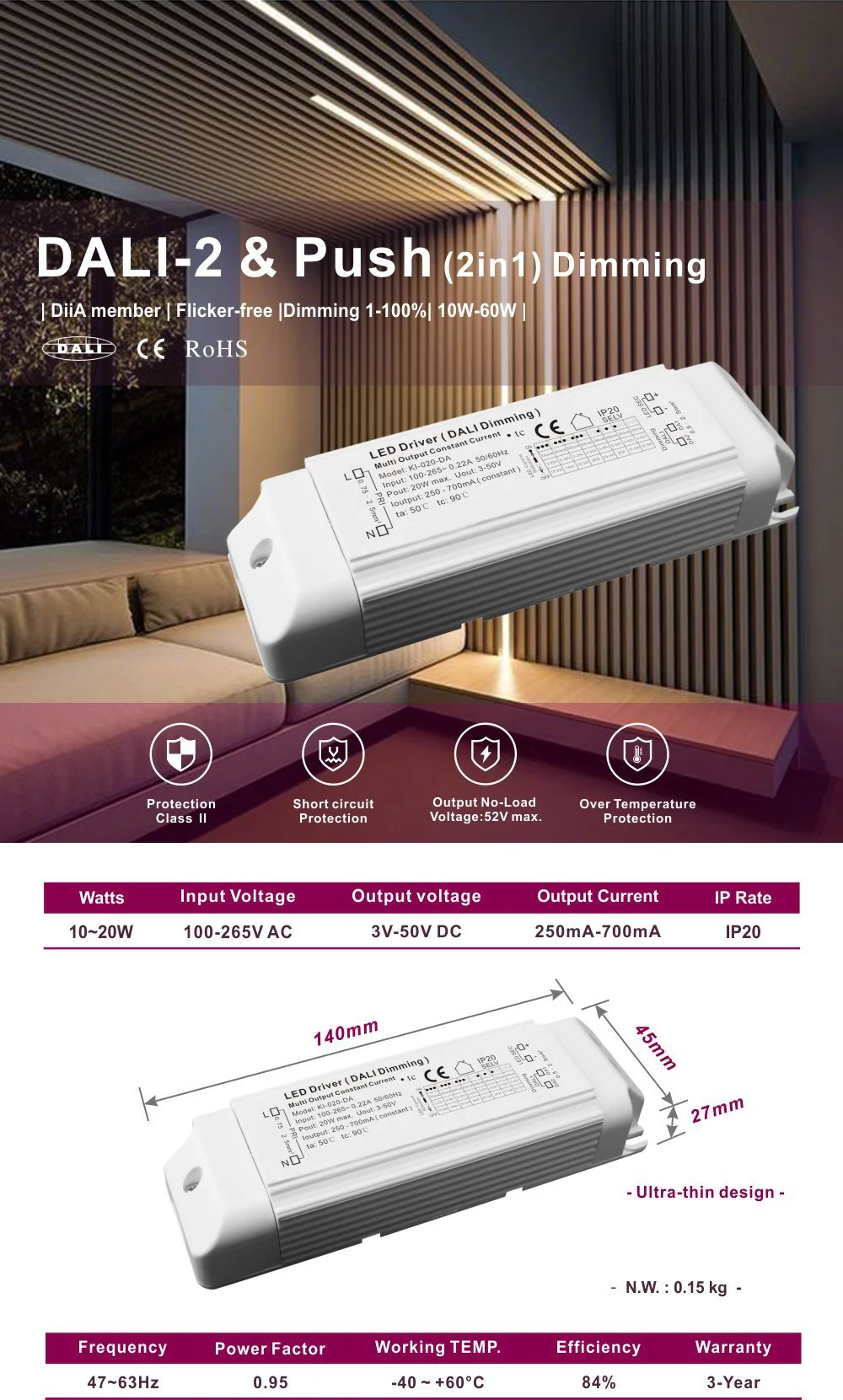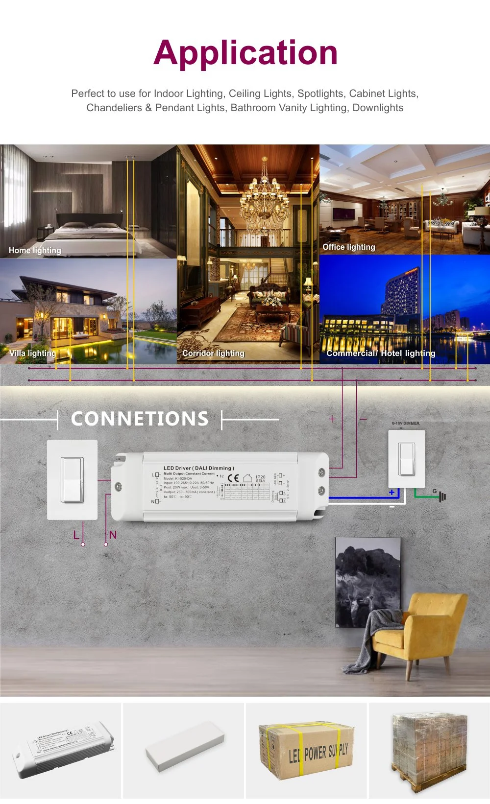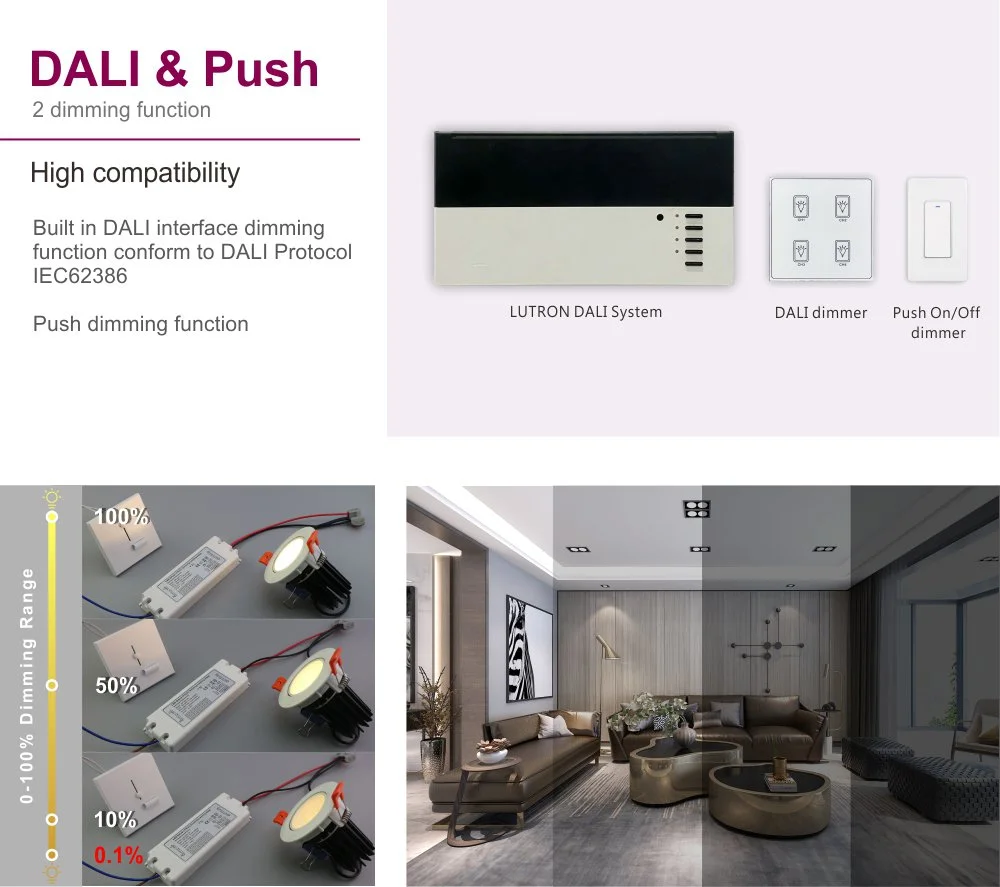 Sein kompaktes Design erleichtert die Installation und Integration und bietet umfassenden Überspannungs-, Übertemperatur- und Kurzschlussschutz. Das Produkt eignet sich für Orte wie Museen, Büros und Hotels, die eine intelligente szenenbasierte Lichtsteuerung erfordern, und ist eine ideale Treiberlösung für effiziente Energieeinsparung und flexibles Lichtumgebungsmanagement.