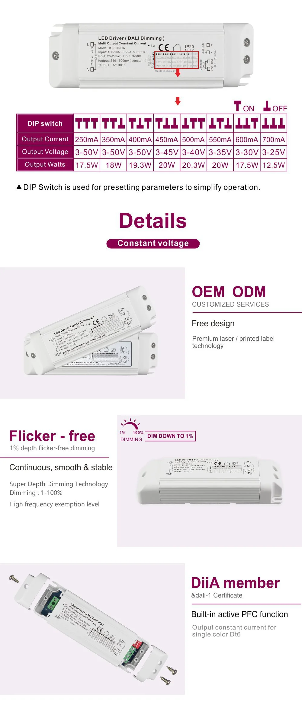 20 W 350 mA Konstantstrom-Dali-Push-Dimm-LED-Treiber. Dieser Treiber unterstützt den innovativen Dali Push-Dimm-350-mA-Konstantstrom-20-W-LED-Treiber-Betriebsmodus, der es Benutzern ermöglicht, das Licht manuell über einfache Tasten einzustellen, was die Flexibilität bei der Installation, Inbetriebnahme und im täglichen Gebrauch erheblich erhöht. Gleichzeitig reduziert der 20-W-Dali-Dimm-LED-Treiber mit konstantem Strom von 1000 mA und einem Wirkungsgrad von 89 % für LED-Beleuchtung mit einem Umwandlungswirkungsgrad von bis zu 89 % den Energieverbrauch und den Wärmeverlust erheblich, sodass er für Beleuchtungsszenarien mit höheren Anforderungen an Leistung und Wärmeableitung geeignet ist.