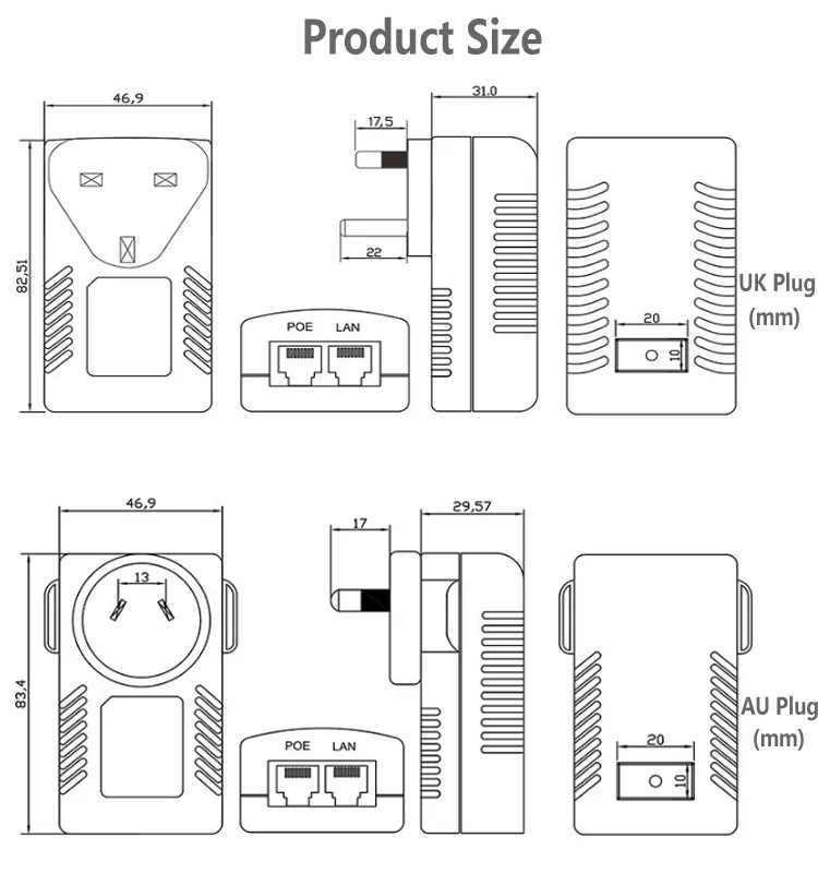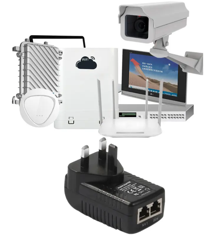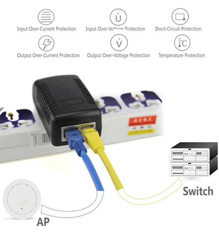 Die kompakte Wandsteckerstruktur ermöglicht die direkte Verwendung mit Standardsteckdosen, ohne dass zusätzliche Halterungen oder Kabel erforderlich sind. Dieser 24V 1A 48V 0,5A POE-Injektor spart Platz und vereinfacht die Verkabelung, was ihn zur idealen Wahl für Heim-, Büro-, Laden- und kleine Überwachungssysteme macht.