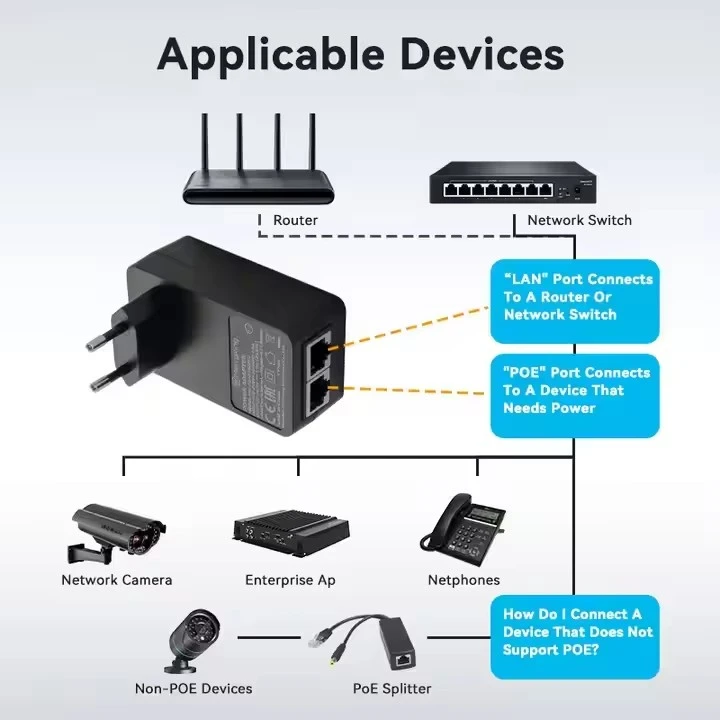 STARWELL ist ein renommierter und professioneller Hersteller von 12V 24V 48V Universal-POE-Adaptern mit Sitz in China. Wir haben unseren Ruf durch die Herstellung qualitativ hochwertiger Produkte zu angemessenen Preisen aufgebaut und bedienen Kunden weltweit mit zuverlässigen Netzwerklösungen, die Innovation mit praktischem Design verbinden. Unsere PoE-Injektoren sind so konzipiert, dass sie ein umfassendes Spektrum an Übertragungsraten unterstützen, darunter 10/100/1000 M, 2,5 G, 5 G und 10 G. Diese außergewöhnliche Flexibilität ermöglicht die nahtlose Integration mit verschiedenen Ethernet-Geräten, von älteren Geräten bis hin zu Anwendungen mit hoher Bandbreite, und gewährleistet so sowohl eine zuverlässige Stromversorgung als auch eine unterbrechungsfreie Datenübertragung in Ihrer gesamten Netzwerkinfrastruktur. Die PoE-Injektoren von STARWELL halten sich strikt an die PoE++-Standards IEEE802.3.af/at/bt und gewährleisten so eine umfassende Kompatibilität mit praktisch allen PoE-fähigen Geräten auf dem Markt. Diese Konformität ermöglicht eine effiziente Stromversorgung und unterstützt gleichzeitig erweiterte Funktionen wie Remote-Geräteverwaltung und Echtzeit-Stromüberwachung, wodurch Netzwerkadministratoren eine bessere Kontrolle über ihre Installationen erhalten.