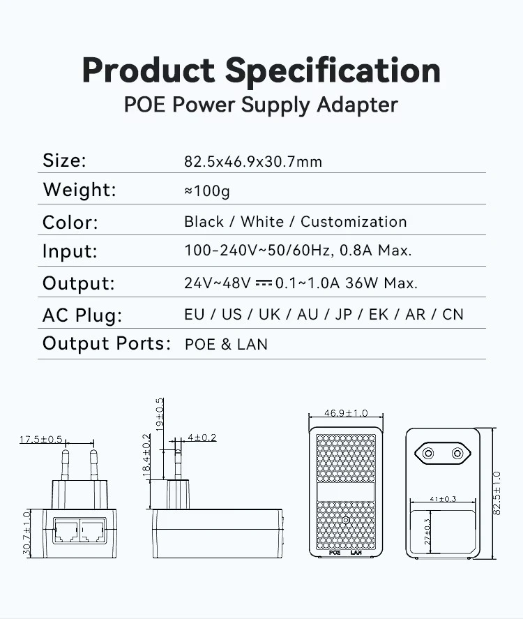 Der wandmontierte 24-V-1A-POE-Injektor mit EU-Stecker von STARWELL Factory verfügt über einen universellen Wechselstromeingang (100–240 V) mit wählbaren Ausgängen: 24 V/0,5 A, 24 V/1 A oder 48 V/0,5 A. Es unterstützt sowohl passive als auch aktive PoE-Protokolle mit flexiblen Pinbelegungen, einschließlich Midspan (4,5+/7,8-) und Endspan (1,2+/3,6-). Es ist vollständig mit den PoE++-Standards IEEE802.3af/at/bt kompatibel und bietet außergewöhnliche Datengeschwindigkeitsfunktionen von 10/100/1000 M bis 2,5 G/5 G/10 G Bit/s.