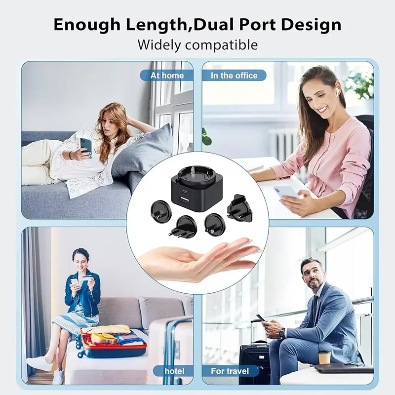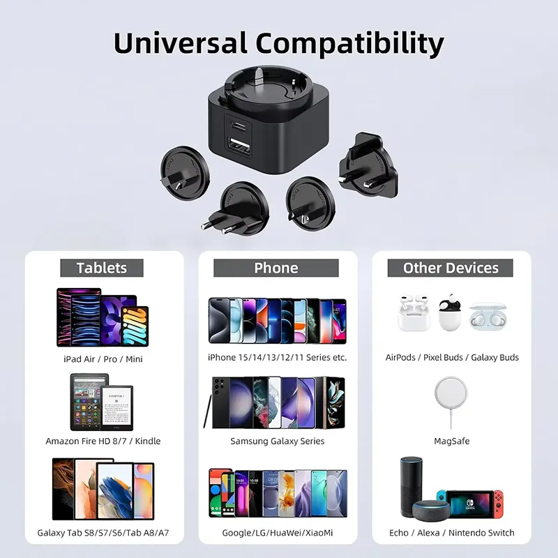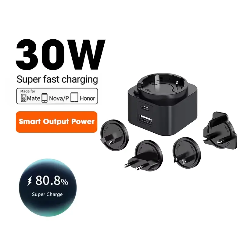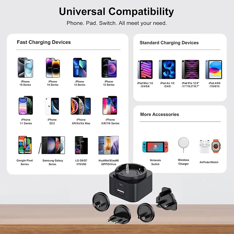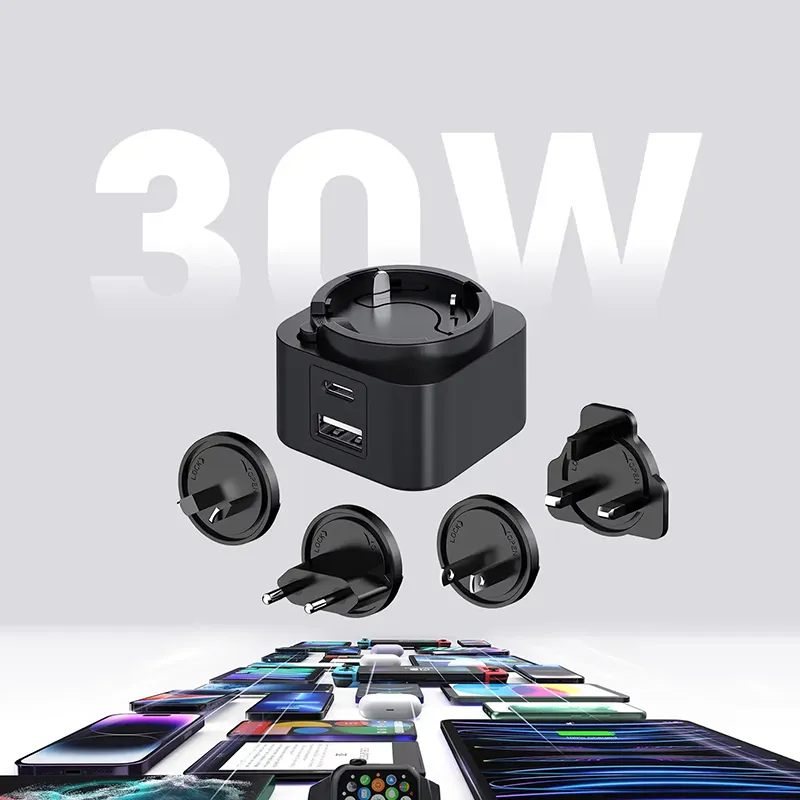 Vielseitigkeit ist der Schlüssel. Das Dual-Port-Design (USB-C/USB-A) ermöglicht das gleichzeitige Laden von zwei Geräten. Das 30-W-PD-Ladegerät mit austauschbarem Stecker verfügt über einen Satz austauschbarer Stecker (US/EU/UK/AU), was es zu Ihrem perfekten Reisebegleiter rund um den Globus macht. Egal, ob Sie ein Smartphone, Tablet oder Laptop aufladen, die universelle Kompatibilität sorgt für erstklassige Leistung.