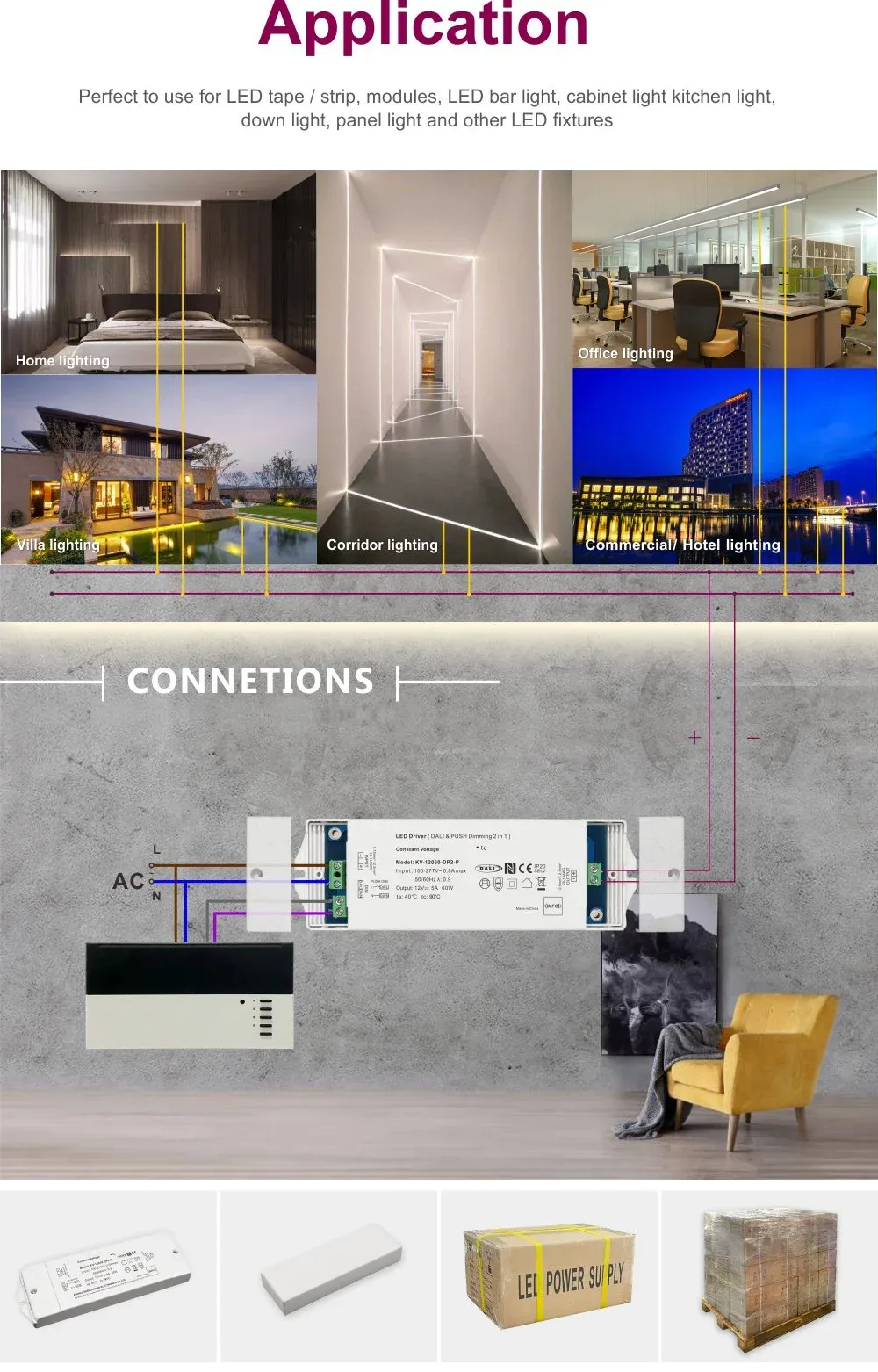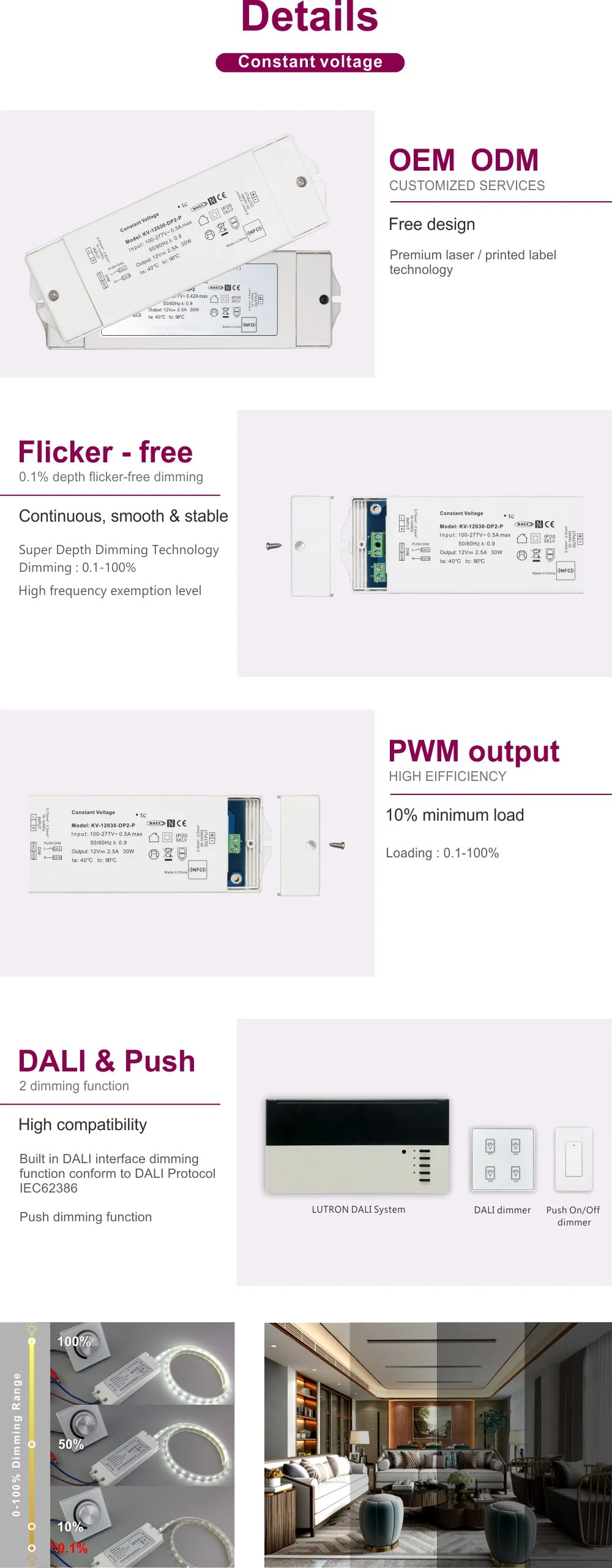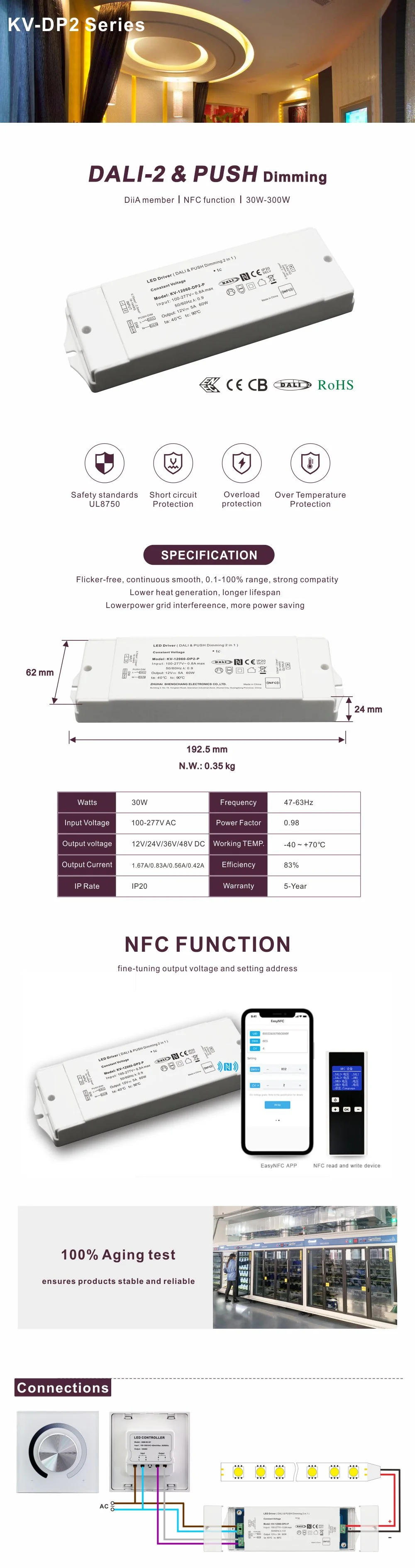 Zusätzlich zu seiner leistungsstarken DALI-Funktionalität bietet dieser Treiber ein herausragendes Dimmerlebnis. Es wird ein seidenweicher NFC-Dimming-Effekt ohne Flimmern erzielt, der selbst bei niedrigen Helligkeitsstufen sichtbares Flackern und Zittern vollständig eliminiert, das Sehvermögen wirksam schützt und eine angenehme und gesunde Lichtumgebung schafft. Sein Design mit großem AC-Eingangsspannungsbereich (Eingang 100–265 V) ermöglicht die Anpassung an Spannungsschwankungen in Stromnetzen weltweit und gewährleistet so einen stabilen Betrieb in verschiedenen Regionen.