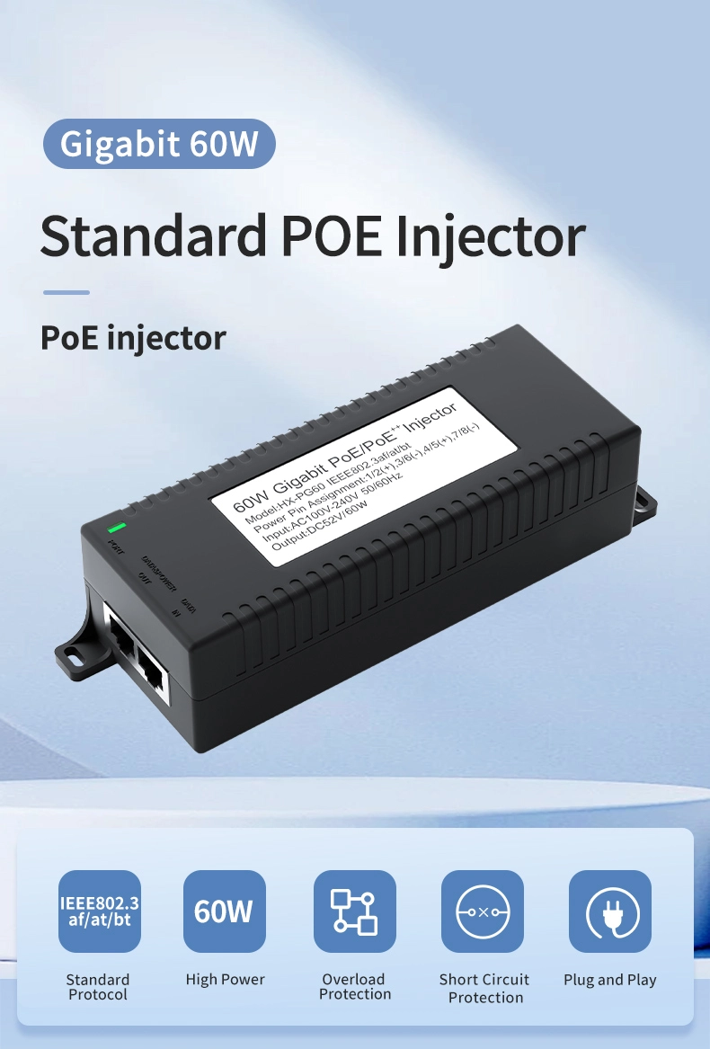 Kaufen Sie einen hochwertigen 60-W-Desktop-POE-Injektor mit IEEE802.3AF/AT/BT von Starwell, einem professionellen Hersteller von PoE-Injektoren in China. Es hält sich strikt an die internationalen Standards IEEE 802.3af/at/bt und ist für die gleichzeitige Übertragung von Strom und Daten über Ethernet-Kabel für Netzwerkgeräte konzipiert. Es unterstützt eine Ausgangsleistung von bis zu 60 W und kann leistungsstarke PoE-fähige Geräte wie PTZ-Domekameras, hochauflösende Kameras, drahtlose APs und Videotelefone perfekt aufnehmen und betreiben. Der Injektor verfügt über ein kompaktes Desktop-Design und verfügt über einen direkten Netzstecker für Plug-and-Play-Komfort, ohne dass eine zusätzliche Konfiguration erforderlich ist. Es ist mit einem intelligenten Schaltungsschutzmechanismus ausgestattet, der Überstrom, Überspannung und Kurzschlüsse wirksam verhindert und so eine stabile und sichere Stromversorgung für Endgeräte in verschiedenen Installationsumgebungen gewährleistet.