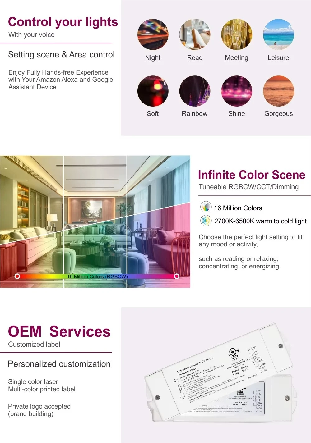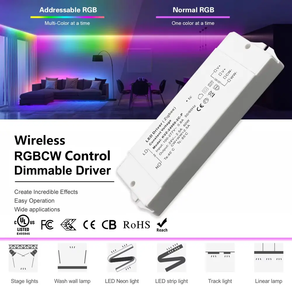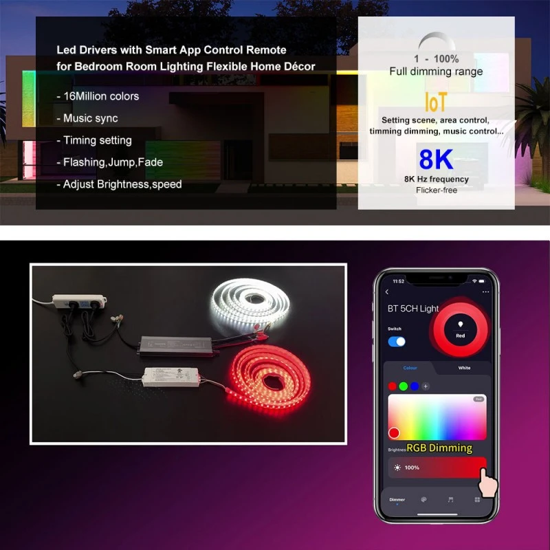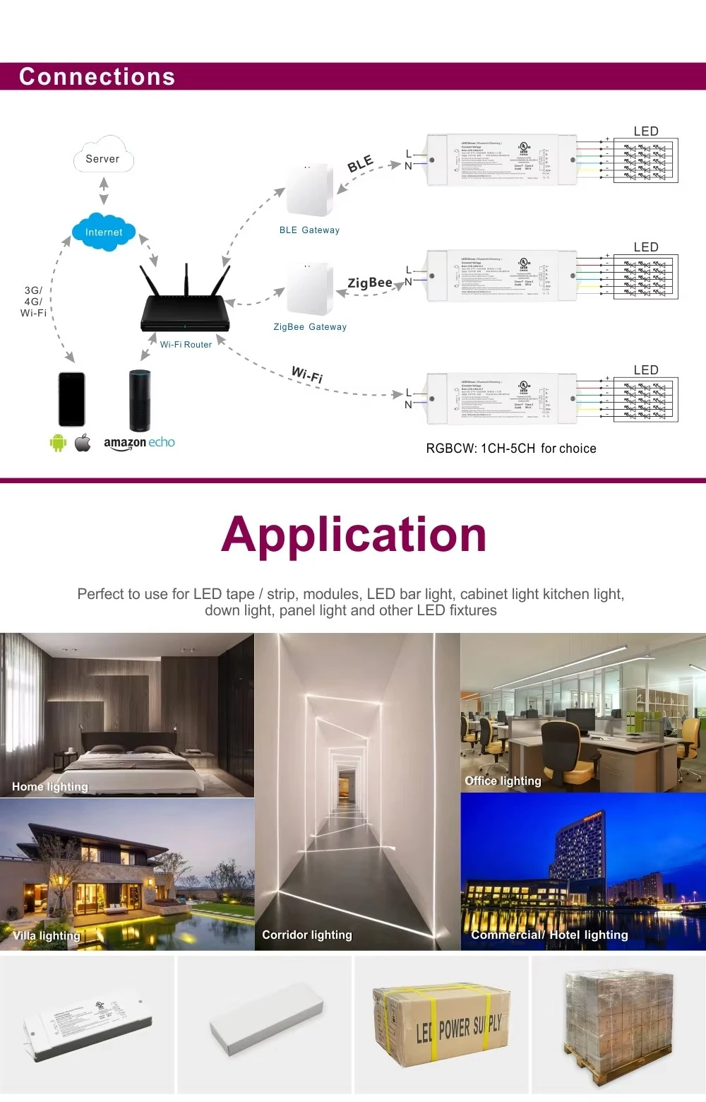 Intelligentes Dimmen auf Knopfdruck Ausgestattet mit einem integrierten ZigBee-Funkmodul mit TUYA-Technologie bietet dieser Treiber eine nahtlose intelligente Steuerung. Passen Sie die Helligkeit über eine mobile App oder Sprachbefehle über Google Home und Amazon Echo an. Der hochfrequente 8K-Hz-PWM-Ausgang sorgt für völlig flimmerfreies Dimmen, während der Dimmbereich von 1–100 % mit 1 % Tiefe sanfte Übergänge und eine perfekte Atmosphärengestaltung ermöglicht.