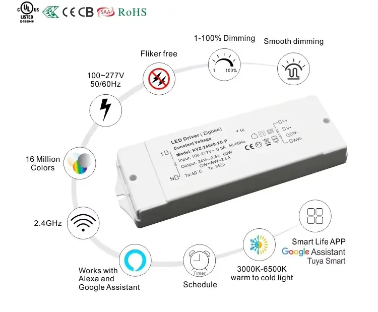 Erleben Sie die perfekte Mischung aus intelligenter Konnektivität, präziser Steuerung und zuverlässiger Leistung mit unserem 60-W-ZigBee-TUYA-Dimmtreiber.