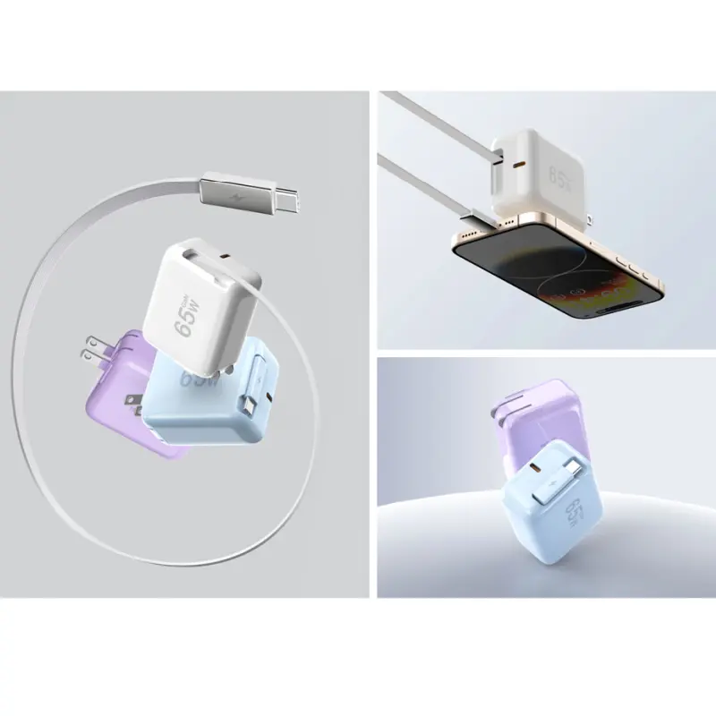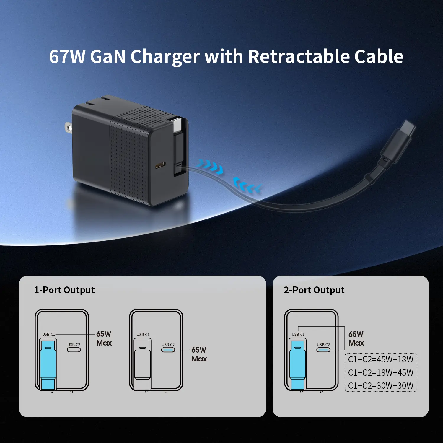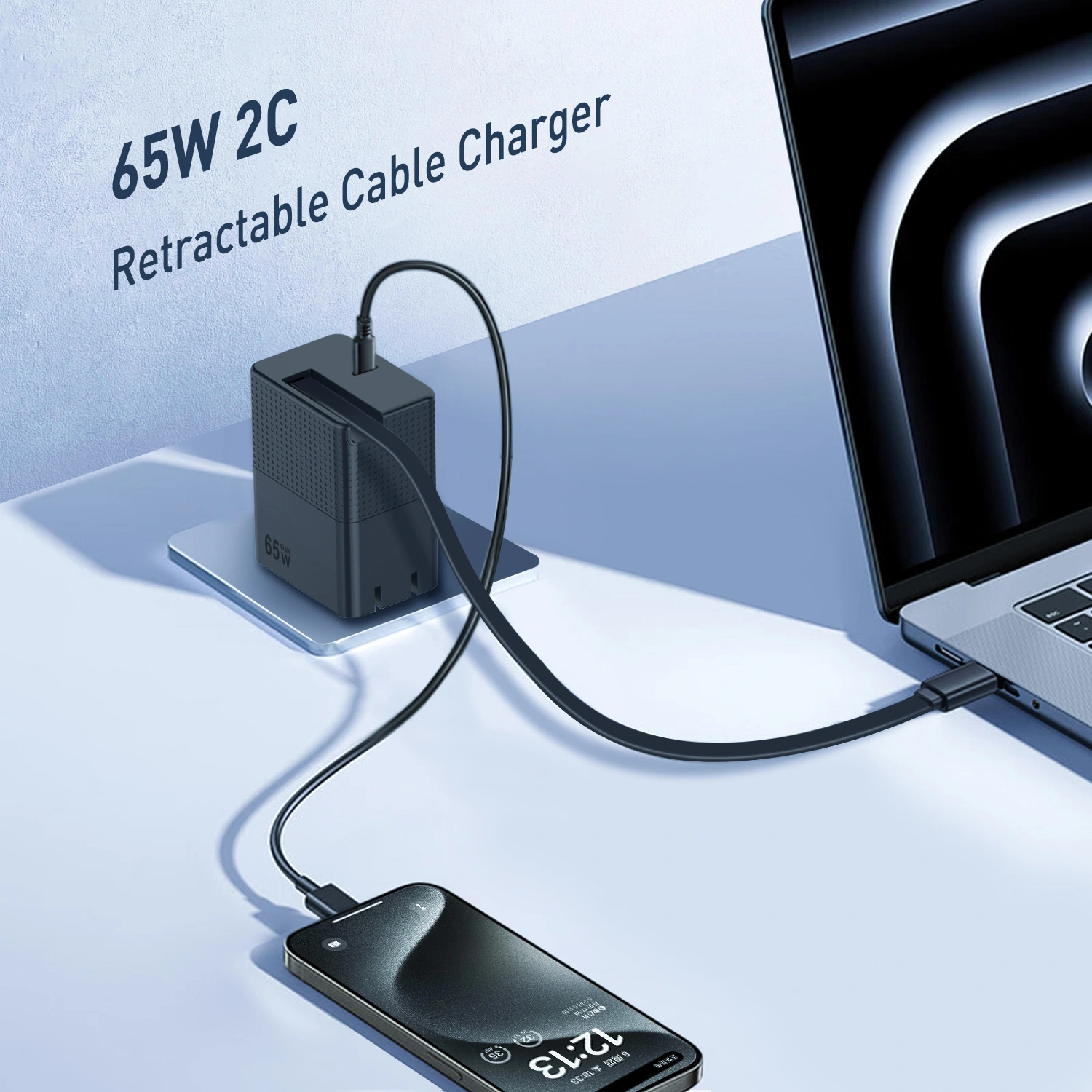 Ausgestattet mit einziehbaren Kabeln: Der 65-W-Schnellladeadapter ist mit einem praktischen und nicht verheddernden 2,3 Fuß (1 Meter) langen USB-C-Datenkabel ausgestattet. Dieses Kabel lässt sich problemlos aus- und einfahren, sodass kein Kabelsalat entsteht und Sie jederzeit aufladen können.