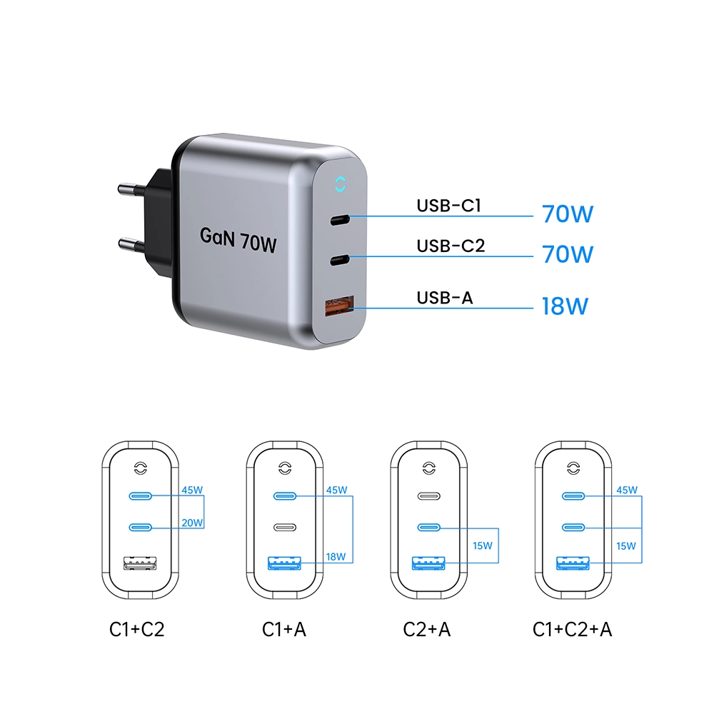 C1/C2-Ausgang: 5V3A, 9V3A, 12V3A, 15V3A, 20,6V3,4A (max. 70W) PPS: 3,3-11V 4,05A USB-A-Ausgang: 5V3A, 9V2A, 12V1,5A 3,3-11V 2A (max. 22W) C1+C2-Ausgang: 45W+20W C1+C2+USB-A-Ausgang: 45W+5V3A Gesamt: 70 W |