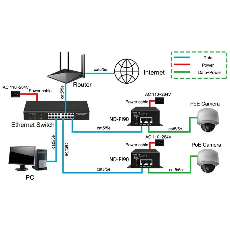 Hochgeschwindigkeits-Datenübertragung Ausgestattet mit einem Gigabit-PoE-Port und einem Gigabit-RJ45-Uplink-Port unterstützt dieser aktive 48-V-POE-Injektor Datenübertragungen mit 1000 Mbit/s über Cat5e-, Cat6- oder höher-Kabel. Es nutzt alle vier verdrillten Paare (1/2,3/6,4/5,7/8) für die gleichzeitige Strom- und Datenbereitstellung und gewährleistet so nahtlose Konnektivität und Signalintegrität für bandbreitenintensive Anwendungen.