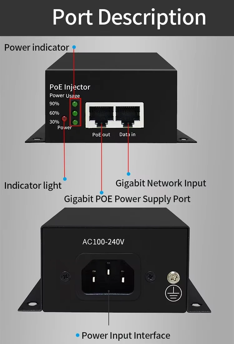 Zuverlässige Leistung Mit einem Eingangsspannungsbereich von AC100–240 V und einem stabilen DC48V1,25A-Ausgang liefert der batteriebetriebene POE-Injektor sauberen und gleichmäßigen 48-V-PoE-Strom an angeschlossene Geräte. Es unterstützt die Powerline-Kernkonfiguration von 1/2,4/5(+) und 3/6,7/8(-) und gewährleistet so eine breite Kompatibilität mit verschiedenen PoE-betriebenen Geräten auf der Empfangsseite.