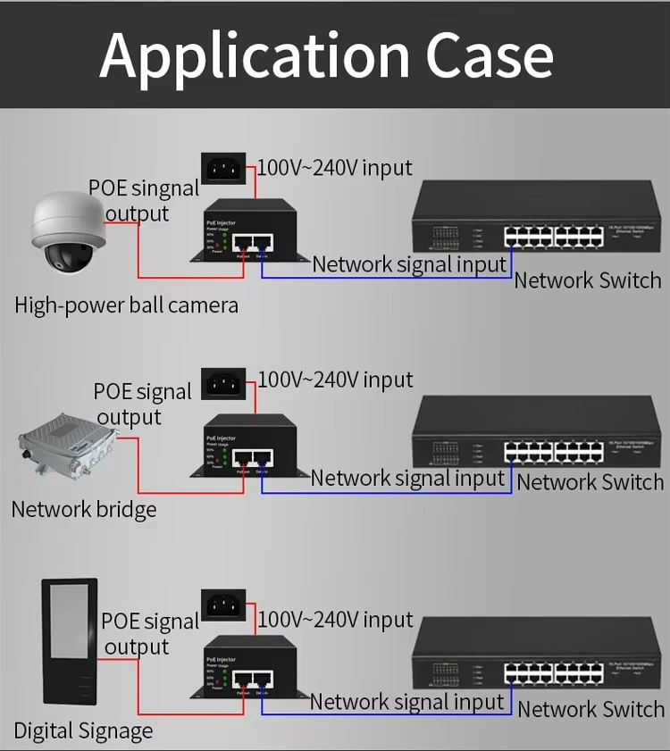 Die PoE-Produkte bieten standardmäßige PoE-, PoE+-, PoE++- und andere Spezifikationen, um eine stabile Stromversorgung und Datenübertragung für drahtlose APs, Netzwerkkameras, IP-Telefone und andere Geräte zu gewährleisten, die Verkabelung zu vereinfachen und die Kosten zu senken.
