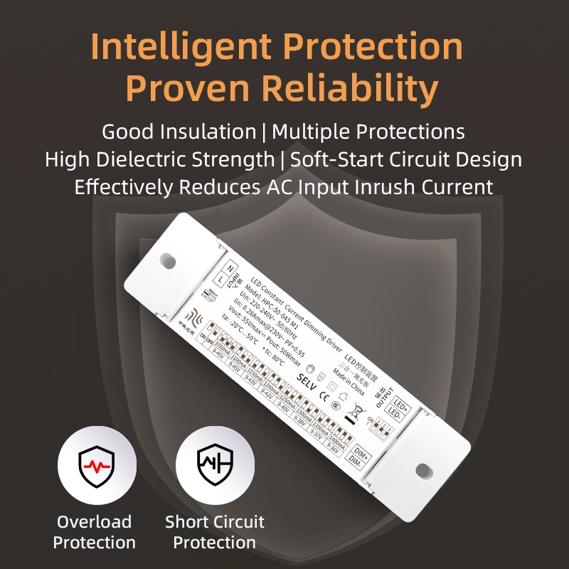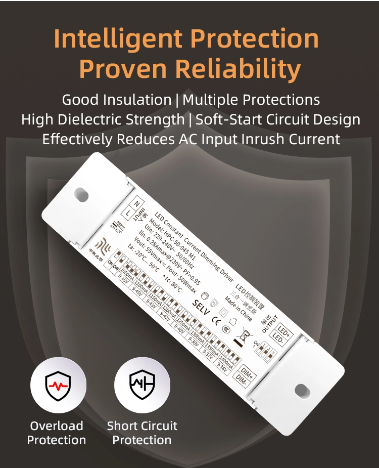 Mehrfachschutzdesign: Ausgestattet mit vier Schutzmechanismen: Überspannung (Schutzschwelle ≥55 V), Überstrom (Schutzschwelle ≥0,18 A), Kurzschluss und Überhitzung (Schutztemperatur ≥110 °C). Bei anormalen Arbeitsbedingungen kann die Ausgabe schnell unterbrochen werden, um den Treiber und die LED-Lichtquellen vor Schäden zu schützen.