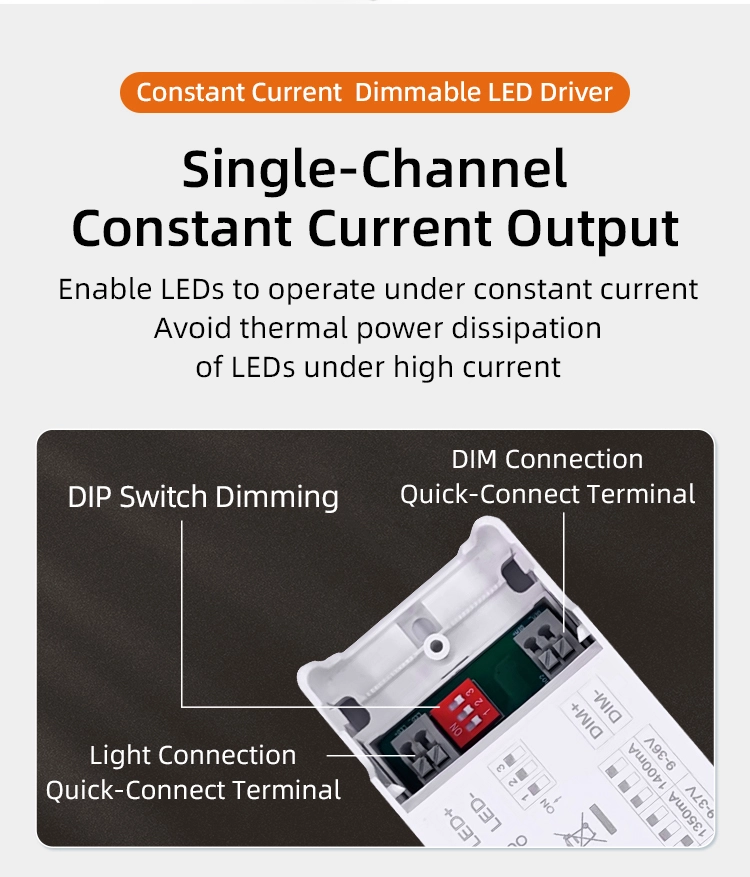 Dual-Dimmmodi: Der Konstantstrom-Dimm-LED-Treiber unterstützt den Dual-Dimmsignaleingang 0–10 V/1–10 V. Der Dimmbereich beträgt 0-100 %, mit einer Dimmlinearität von ≥95 %. Es kann ein nahtloser und sanfter Übergang von dunkler zu voller Helligkeit ohne Dimm-Jitter oder -Verzögerung erreicht werden. Es ist mit verschiedenen intelligenten Dimmsystemen kompatibel und kann die Beleuchtungsanforderungen verschiedener Szenarien erfüllen.