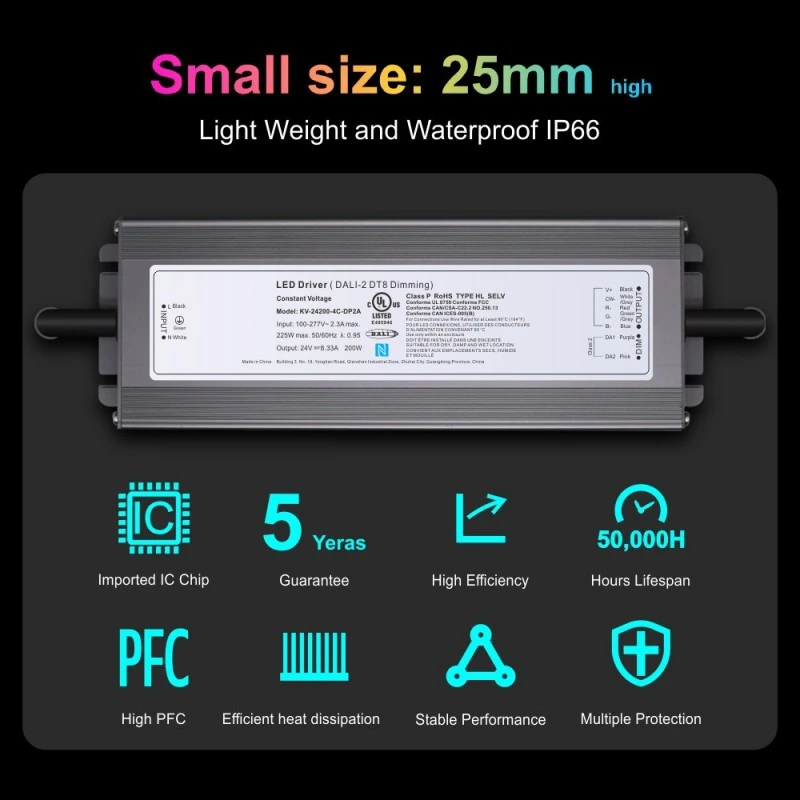 Die Qualität und Sicherheit, die wir versprechen, spiegelt sich in jedem Detail wider. Das Produkt verfügt über die UL-Zertifizierung, erfüllt strenge internationale Sicherheitsstandards und wird mit einer 5-Jahres-Garantie zur Qualitätssicherung geliefert. Kurz gesagt handelt es sich hierbei nicht nur um ein Netzteil; Es ist ein leistungsstarkes, zuverlässiges und flexibles Herzstück der Lichtsteuerung. Mit der Wahl dieses echten dimmbaren 200-W-LED-Treibers DALI 2 DT8 entscheiden Sie sich für eine professionelle, intelligente Beleuchtungslösung, die zukunftsorientiert ist.
