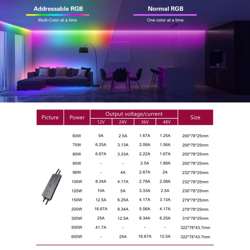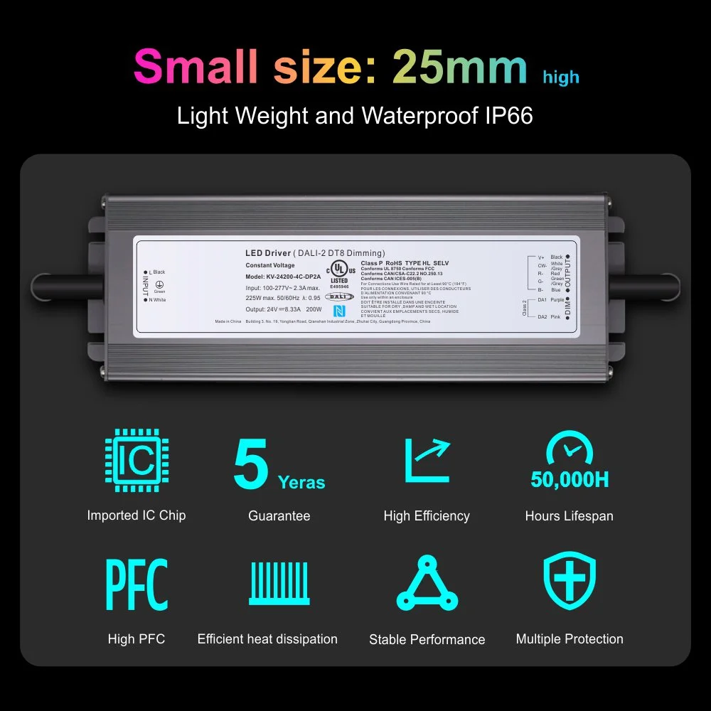Sein Kerndesign ist darauf ausgerichtet, die anspruchsvollsten Installations- und Anwendungsanforderungen zu erfüllen. Das Netzteil verfügt über einen Konstantspannungsausgangsmodus, der eine stabile Gleichspannung von 12 V oder 24 V liefert und für den Betrieb verschiedener LED-Streifenlichter und -Module optimiert ist. Beeindruckend ist, dass es trotz der leistungsstarken Antriebsleistung von 200 W eine ultrakompakte Größe erreicht und dadurch erheblich Platz bei der Installation in Anschlusskästen oder schmalen Decken spart. Die Produktserie ist flexibel und bietet verschiedene Kanalversionen von 1 bis 5 Kanälen: Die Einkanalversion dient zum reinen Dimmen, die Zweikanalversion steuert unabhängig voneinander kalt- und warmweißes Licht, um eine umfassende CCT-Anpassung zu erreichen, und die Fünfkanalversion ist ein leistungsstarker DALI-Konstantspannungs-RGB-CCT-dimmbarer 200-W-LED-Treiber, der gleichzeitig RGB-Farben und kalt- und warmweißes Licht steuern kann und so Milliarden von Farben und Atmosphären erzeugt.