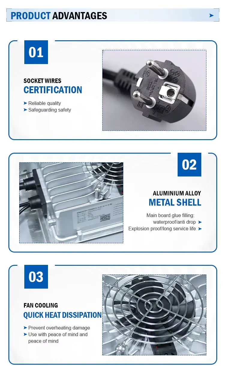 Hohe Effizienz und intelligenter Schutz: Mit einem Wirkungsgrad von bis zu 93 % und einem Leistungsfaktor von ≥0,98 minimiert dieses Ladegerät den Energieverlust und senkt die Betriebskosten. Zu den integrierten Schutzfunktionen gehören Überspannungs-, Kurzschluss-, Verpolungs- und Übertemperaturschutz. Eine LED-Anzeige bietet auf einen Blick einen klaren Ladestatus.