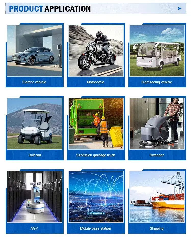 Verwendung: Motorrad/Roller, Dreirad, Erntemaschine, Kehrmaschine, Gabelstapler, LKW, Elektrobus, Blei-Säure-Batterie, Elektrofahrzeug, Sightseeing-Fahrzeug, Logistikfahrzeug, Reinigungsfahrzeug, Streifenwagen, Dünenbuggys, Schiff, Kommunikationsausrüstung