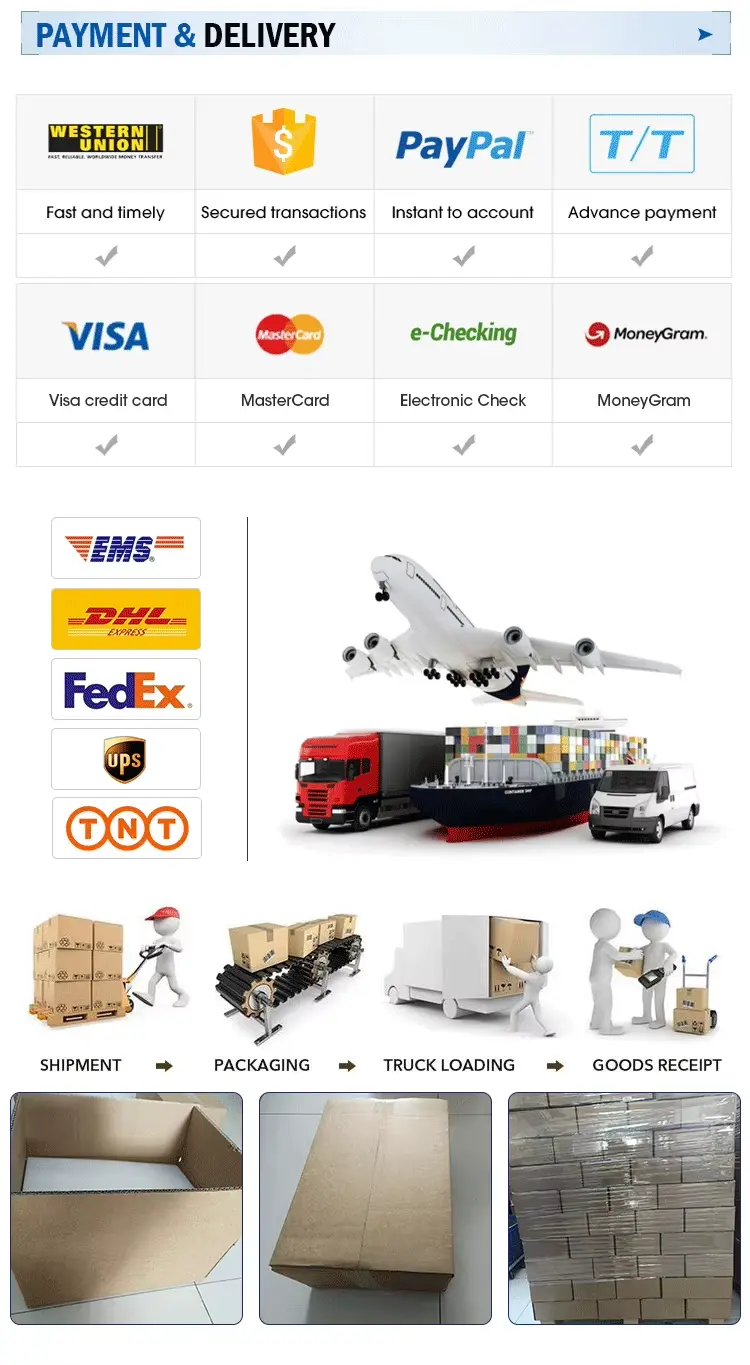 A4:Kleine Bestellungen werden per Express versendet (FEDEX, DHL, EMS, TNT). Große Bestellungen werden per See- oder Luftweg versendet. FOB-Preis verfügbar. Sie können Ihren Spediteur oder unseren nutzen.