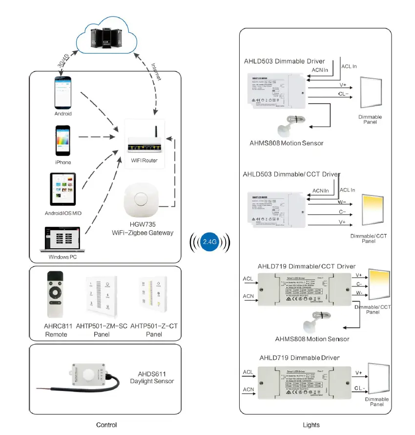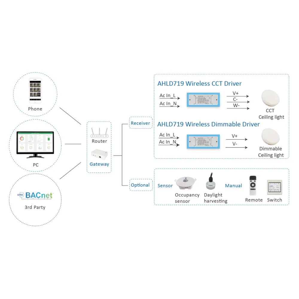 Der Treiber arbeitet in einem Zigbee-Mesh-Netzwerk und stellt eine Verbindung zu einem Zigbee-Gateway her, um intelligente Beleuchtungsfunktionen wie Zeitplanung, Szenensteuerung, Gruppensteuerung und Automatisierung zu ermöglichen. Diese Art von LED-Treiber wird häufig in Smart-Home-Beleuchtungssystemen, kommerziellen Beleuchtungsinstallationen und intelligenten Gebäudesteuerungsumgebungen verwendet.