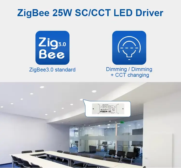 Ein Tuya Zigbee Wireless Control 350mA CCT Dimmbarer LED-Treiber ist ein Konstantstrom-LED-Leistungstreiber, der zur Steuerung abstimmbarer weißer LED-Beleuchtung entwickelt wurde. Es integriert das Zigbee 3.0-Funkprotokoll und ermöglicht es Benutzern, Helligkeit und Farbtemperatur über ein Smartphone, Tablet oder einen Sprachassistenten anzupassen.